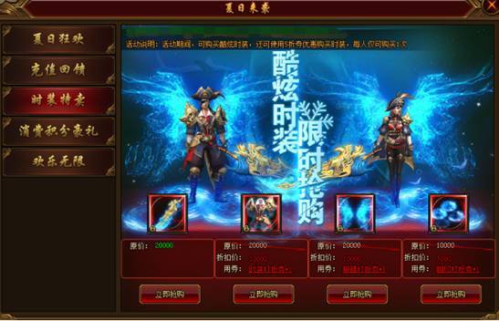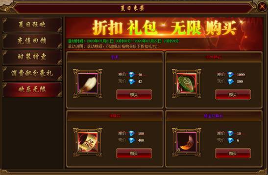 活动内容:活动期间,限时出售折扣价道具,无限欢乐购买。