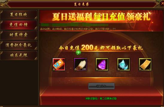 活动内容:活动期间,每日充值即可领取豪华奖励。