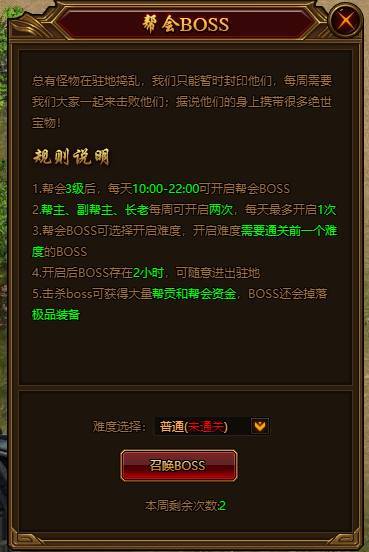 开启后会在帮会驻地中心位置刷出帮会BOSS,帮会玩家可进入自己的帮会驻地击杀BOSS,boss必掉红装!帮会BOSS有多个难度,通关低难度的BOSS才可解锁更高难度的BOSS!