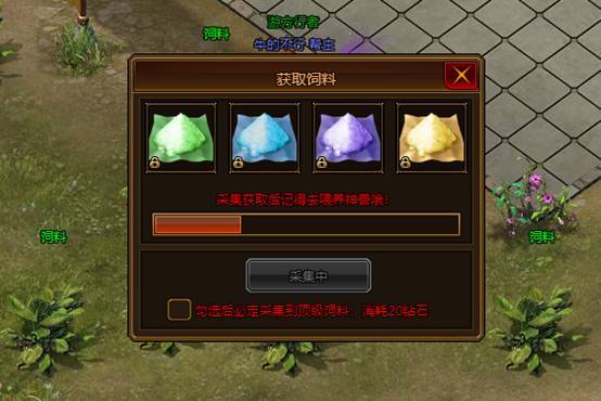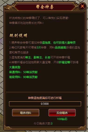 玩家可在帮会驻地采集饲料来喂养帮会神兽;每次只可采集一个饲料,确定收取饲料后才会获得饲料,饲料的等级越高喂养神兽获得的祝福值越高,祝福值满后,可由帮主、副帮主、长老开启神兽祈福!