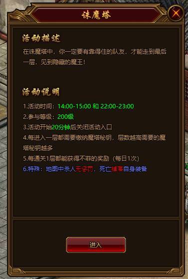 诛魔塔每天14点和22点开启两次,诛魔塔共有10层,每通关1层都能获得不菲的奖励